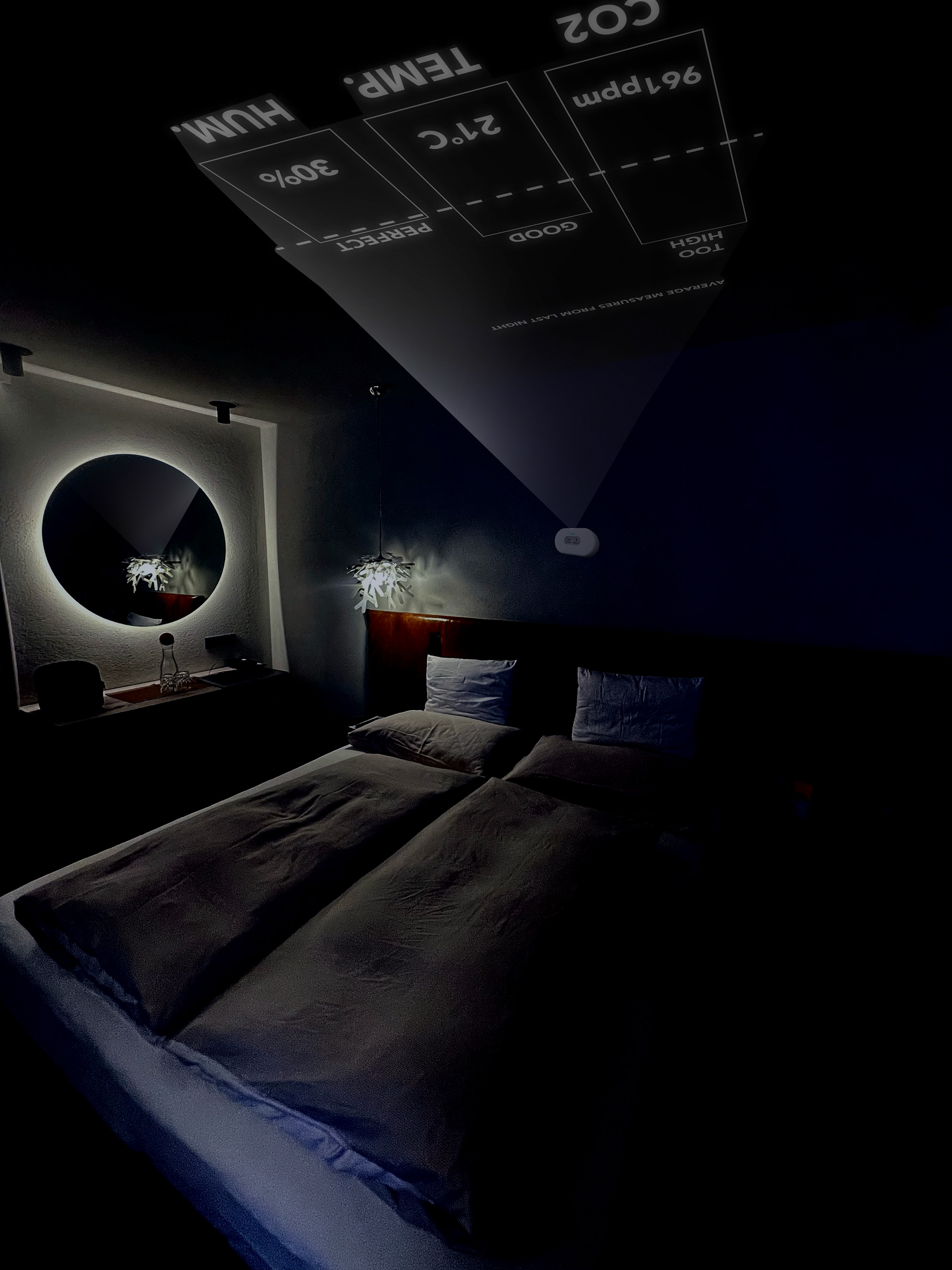 It all starts with the user placing the contact areas for waking up, and calming down to your bedroom. This user has chosen their bed as a canvas to calm down (which also gives a great push to always making your bed in the morning!) and the ceiling as the canvas for their morning stats. The morning stats also functions as a natural light alarm clock, as it brightens over the course of 30 minutes before the users desired wake up time. It will then disappear from the ceiling after another 30 minutes.